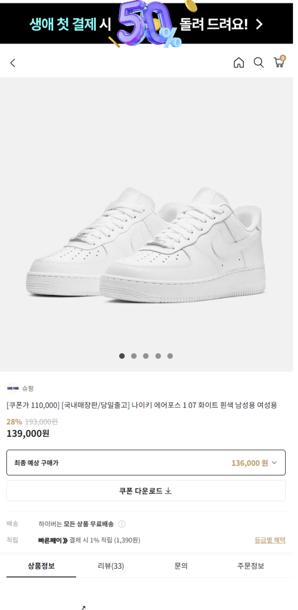 [하이버] 나이키 에어포스 1 07 화이트 (139,000원) (무료배송)