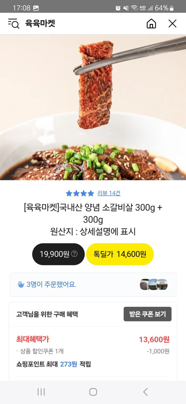 [카카오톡딜] 양념 소갈비 300그램 2팩 (14,900원) (무료)